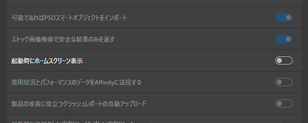 これで、Affinity を起動した時に「ようこそ(ホームスクリーン)」は出なくなります。