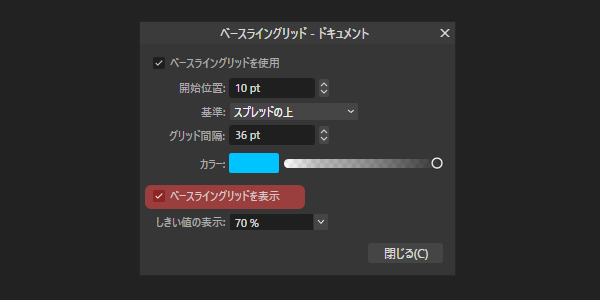 3. ウィンドウが開いたら「ベースライングリッドを使用」にチェックを入れます。(「開始位置」「基準」「グリッド間隔」などは適宜変更して下さい)