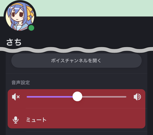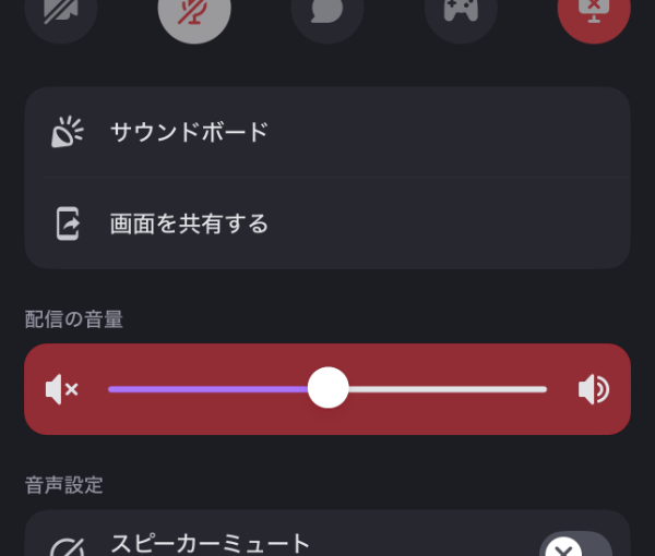 【Discord】 ボイスチャットの「画面共有」や「ユーザー」の音量を変える iPhone(ケータイ関連) X Facebook はてブ LINE コピー 2025.05.12 この記事は約1分で読めます。 記事内に広告が含まれています こんにちは、さち です。 今回は iPhone 版「Discord」公式アプリで、ボイスチャット(通話)の「画面共有」や「ユーザー」の音量を変更する方法について書いていきます。 スポンサーリンク 目次 「画面共有」の音量を変える「ユーザー」の音量を変える 「画面共有」の音量を変える 他のユーザーの「画面共有」を視聴中です。 画面下部にある「コントロールパネル」部分を上にスワイプします。 「配信の音量」を変更します。 「ユーザー」の音量を変える 「ボイスチャット」の画面で、音量を変えたい「ユーザー」を長押しします。 ユーザーの画面が表示されます。「音声設定」から「音量」「ミュート」の変更ができます。