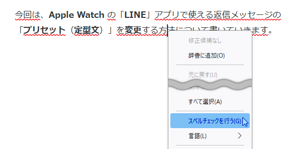 - テキストの編集画面の上で「右クリック」→「スペルチェックを行う」と進んで、チェックを外します。