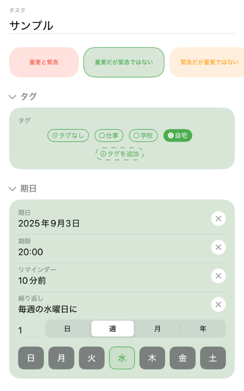 「やること(タスク)」の追加では、「重要度」「緊急度」の分類以外にも、「タグ」付けや「期限」「リマインダー(通知)」の設定ができます。