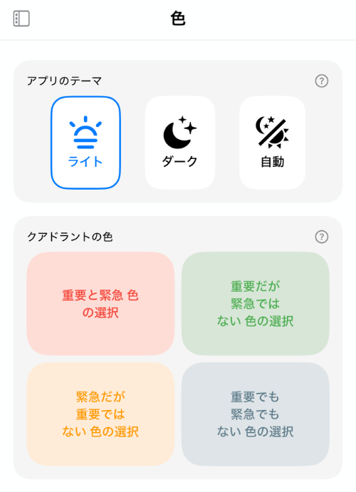 「テーマ」や「マトリクス(クアドラント)」の色などを変えられます。