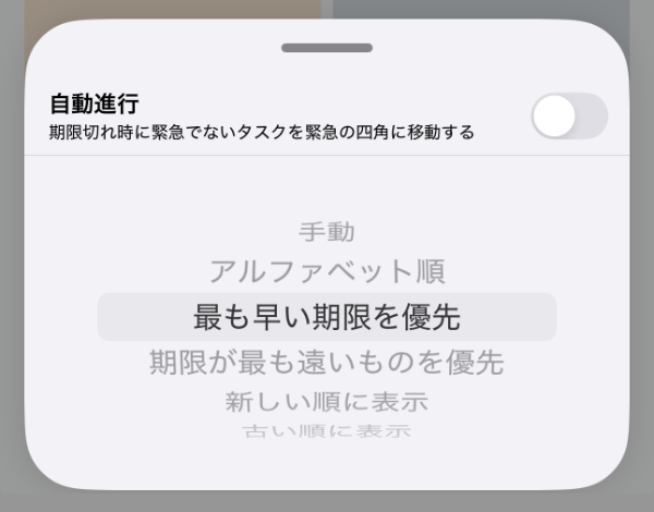 各マトリクス内にある「やること(タスク)」のソートは、「追加順」「期限順」「手動」などから選べます。
