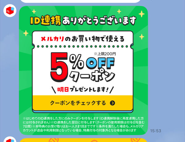 ちなみに、LINE と初めて連携したときにもらえる明日プレゼントの「クーポン」は、翌日の午前9時~10時過ぎに配布されます。計画的に利用しましょう。