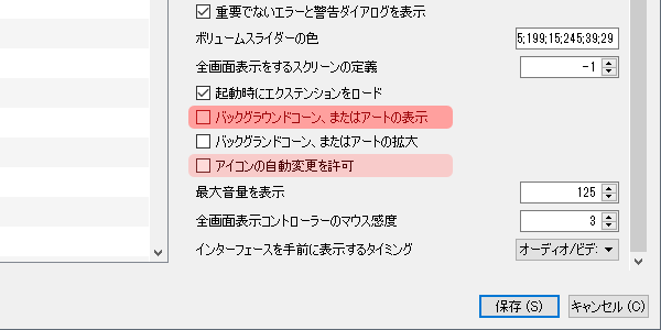 - 「バックグラウンドコーン、またはアートの表示」をオフにします。(ちなみに、「アイコンの自動変更を許可」をオフにすると、クリスマスなどでアイコンが変わるのを防げる)
